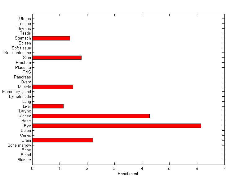 The expression level is normalized with tissue-library size. Each value for a gene in a tissue is a ratio of observed ESTs to the expected one in this tissue. The expected number of ESTs is the product of total ESTs of the gene and the fraction of total ESTs in the tissue among all ESTs in 30 tissues.