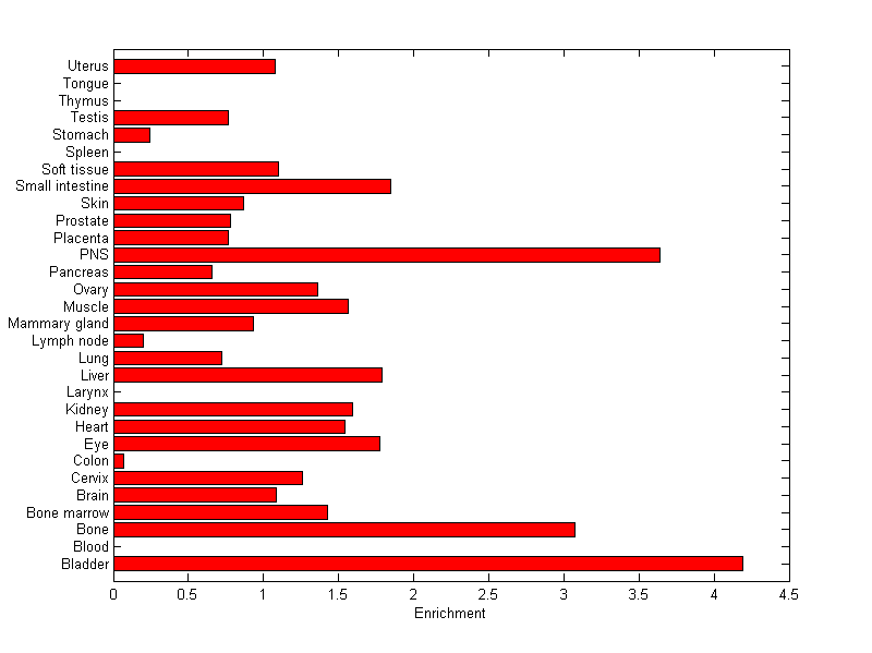 The expression level is normalized with tissue-library size. Each value for a gene in a tissue is a ratio of observed ESTs to the expected one in this tissue. The expected number of ESTs is the product of total ESTs of the gene and the fraction of total ESTs in the tissue among all ESTs in 30 tissues.