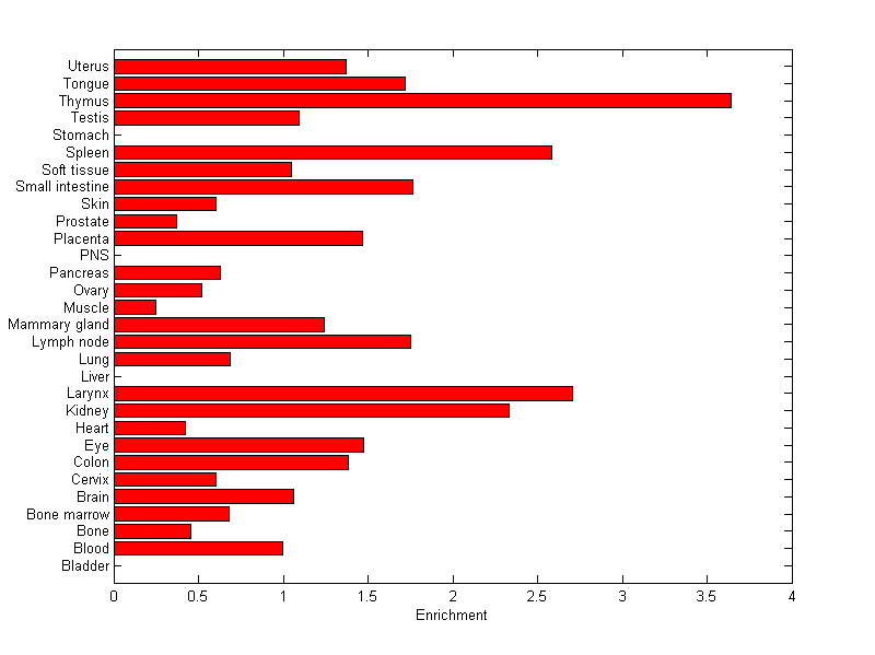 The expression level is normalized with tissue-library size. Each value for a gene in a tissue is a ratio of observed ESTs to the expected one in this tissue. The expected number of ESTs is the product of total ESTs of the gene and the fraction of total ESTs in the tissue among all ESTs in 30 tissues.