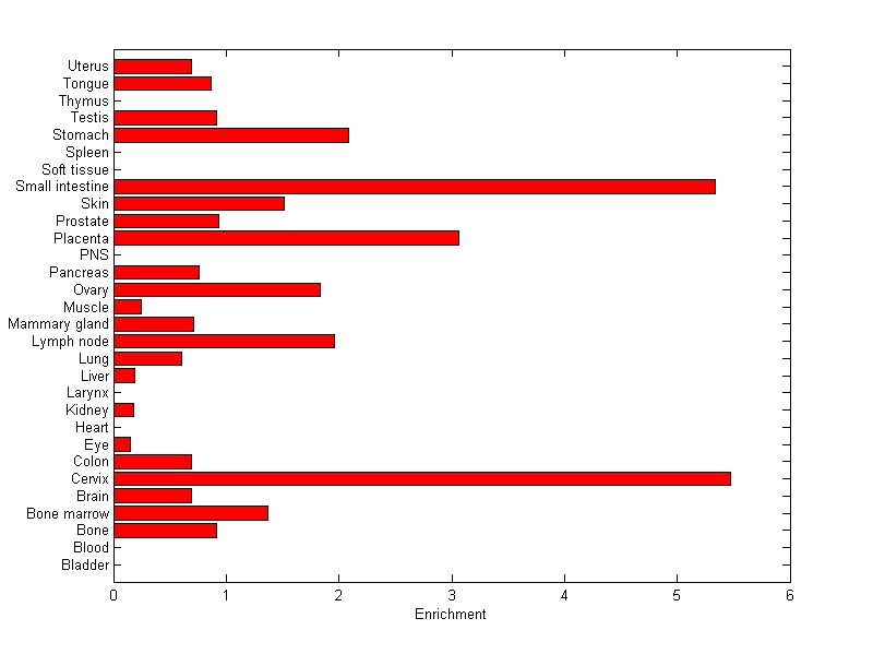 The expression level is normalized with tissue-library size. Each value for a gene in a tissue is a ratio of observed ESTs to the expected one in this tissue. The expected number of ESTs is the product of total ESTs of the gene and the fraction of total ESTs in the tissue among all ESTs in 30 tissues.