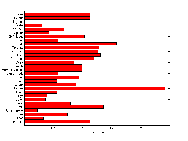 The expression level is normalized with tissue-library size. Each value for a gene in a tissue is a ratio of observed ESTs to the expected one in this tissue. The expected number of ESTs is the product of total ESTs of the gene and the fraction of total ESTs in the tissue among all ESTs in 30 tissues.