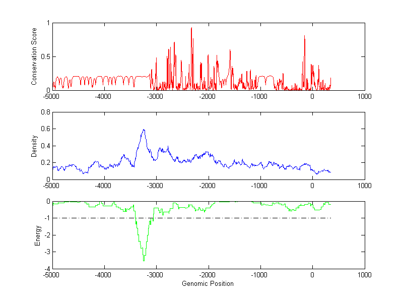 The energy profile (green curve) is about energy for module detection based on TF interaction. The positions with energy less than -1 indicate the existence of CRMs.