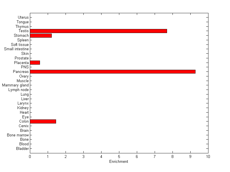 About the profile: The expression level is normalized with tissue-library size. Each value for a gene in a tissue is a ratio of observed ESTs to the expected one in this tissue. The expected number of ESTs is the product of total ESTs of the gene and the fraction of total ESTs in the tissue among all ESTs in 30 tissues. Summary: This gene is preferentially expressed in [pancreas, testis] Download: |