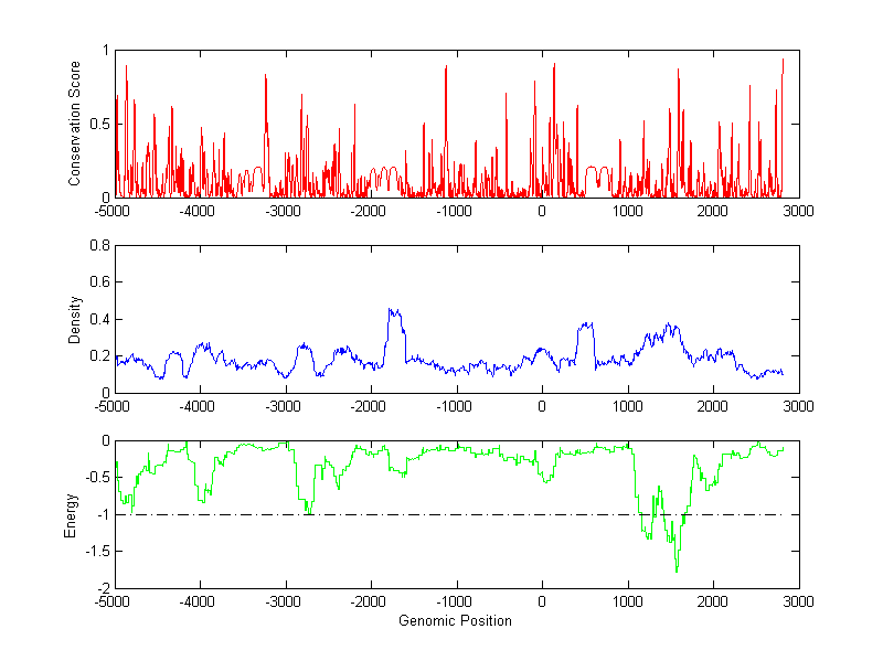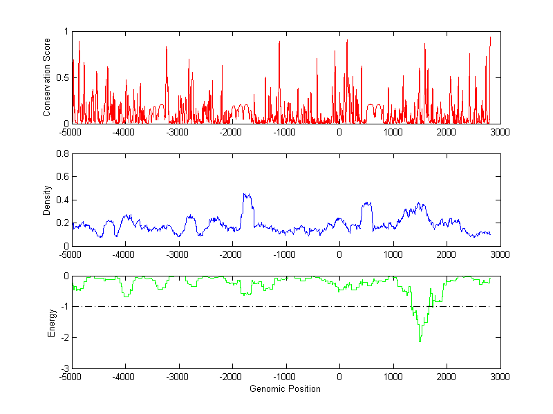 About the profiles: The conservation profile (red curve) is about conservation scores of the promoter sequences. Conservation was determined from an eight-way alignment of human, chimpanzee, dog, mouse, rat, chicken, zebrafish and fugu sequences. The conservation was quantified by a conservation score between 0 and 1, with 1 as highest conservation. The conservation score was obtained from UCSC genome databases. The density profile (blue curve) is about density of all TF binding sites. The energy profile (green curve) is about energy for module detection based on TF interaction. The positions with energy less than -1 indicate the existence of CRMs. Download: Conservation profileDensity profile Energy profile CRM summary |