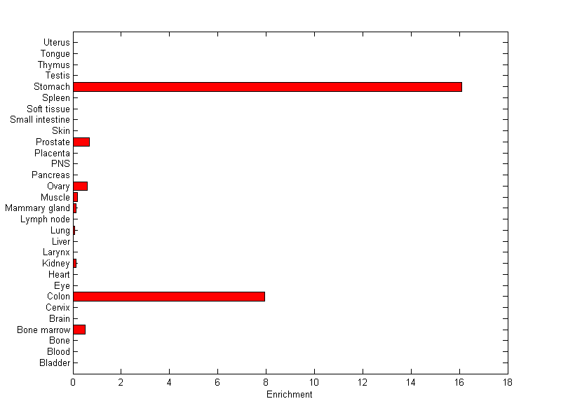 About the profile: The expression level is normalized with tissue-library size. Each value for a gene in a tissue is a ratio of observed ESTs to the expected one in this tissue. The expected number of ESTs is the product of total ESTs of the gene and the fraction of total ESTs in the tissue among all ESTs in 30 tissues. Summary: This gene is preferentially expressed in [colon, stomach] Download: |