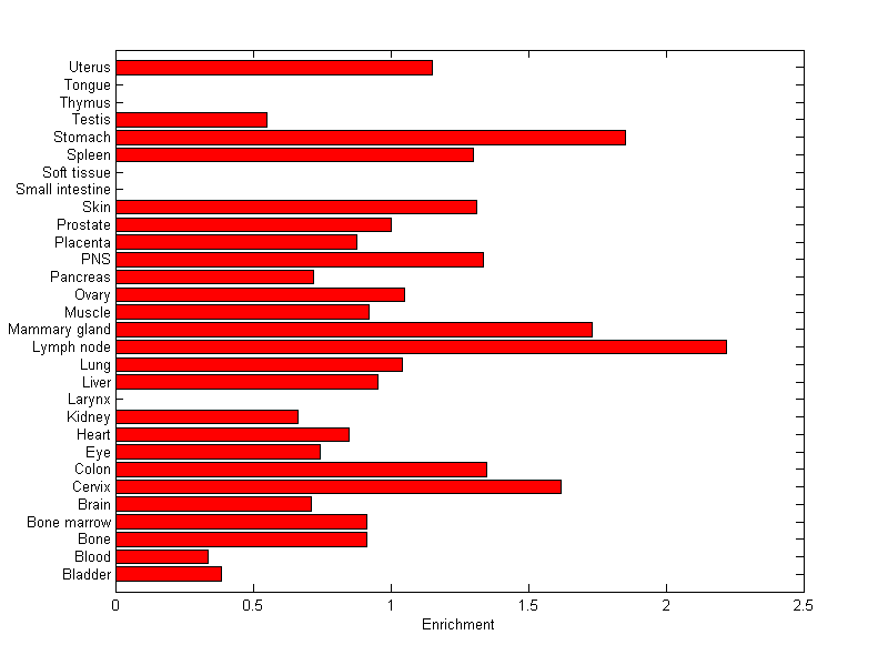 The expression level is normalized with tissue-library size. Each value for a gene in a tissue is a ratio of observed ESTs to the expected one in this tissue. The expected number of ESTs is the product of total ESTs of the gene and the fraction of total ESTs in the tissue among all ESTs in 30 tissues.