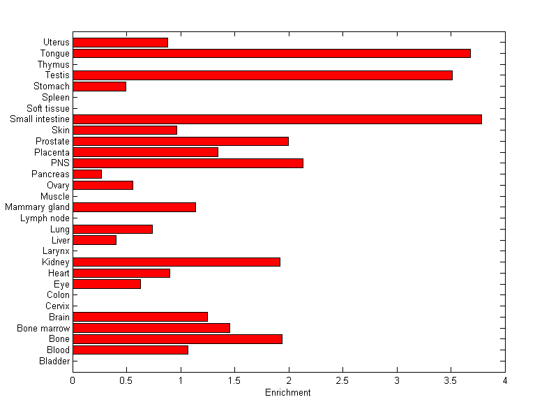 The expression level is normalized with tissue-library size. Each value for a gene in a tissue is a ratio of observed ESTs to the expected one in this tissue. The expected number of ESTs is the product of total ESTs of the gene and the fraction of total ESTs in the tissue among all ESTs in 30 tissues.