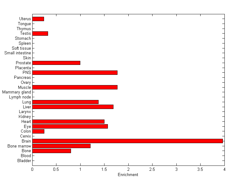 The expression level is normalized with tissue-library size. Each value for a gene in a tissue is a ratio of observed ESTs to the expected one in this tissue. The expected number of ESTs is the product of total ESTs of the gene and the fraction of total ESTs in the tissue among all ESTs in 30 tissues.