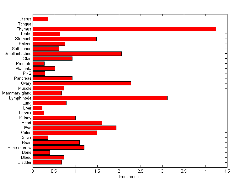 The expression level is normalized with tissue-library size. Each value for a gene in a tissue is a ratio of observed ESTs to the expected one in this tissue. The expected number of ESTs is the product of total ESTs of the gene and the fraction of total ESTs in the tissue among all ESTs in 30 tissues.