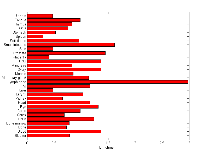 The expression level is normalized with tissue-library size. Each value for a gene in a tissue is a ratio of observed ESTs to the expected one in this tissue. The expected number of ESTs is the product of total ESTs of the gene and the fraction of total ESTs in the tissue among all ESTs in 30 tissues.