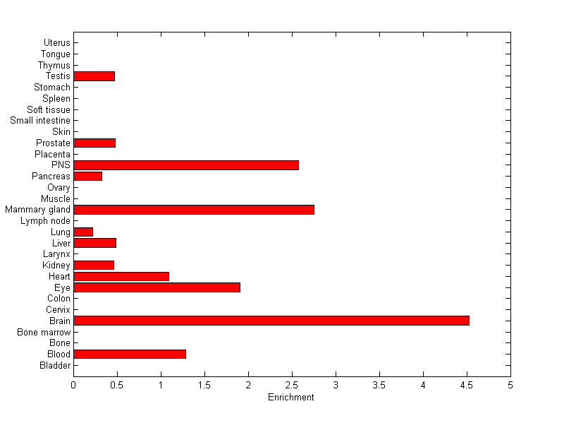 The expression level is normalized with tissue-library size. Each value for a gene in a tissue is a ratio of observed ESTs to the expected one in this tissue. The expected number of ESTs is the product of total ESTs of the gene and the fraction of total ESTs in the tissue among all ESTs in 30 tissues.
