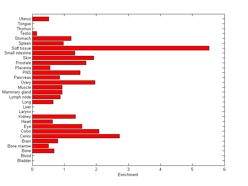The expression level is normalized with tissue-library size. Each value for a gene in a tissue is a ratio of observed ESTs to the expected one in this tissue. The expected number of ESTs is the product of total ESTs of the gene and the fraction of total ESTs in the tissue among all ESTs in 30 tissues.