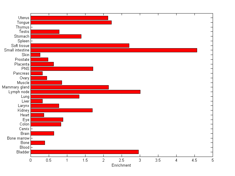 The expression level is normalized with tissue-library size. Each value for a gene in a tissue is a ratio of observed ESTs to the expected one in this tissue. The expected number of ESTs is the product of total ESTs of the gene and the fraction of total ESTs in the tissue among all ESTs in 30 tissues.