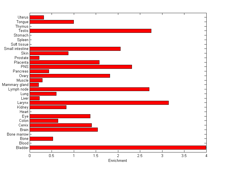 The expression level is normalized with tissue-library size. Each value for a gene in a tissue is a ratio of observed ESTs to the expected one in this tissue. The expected number of ESTs is the product of total ESTs of the gene and the fraction of total ESTs in the tissue among all ESTs in 30 tissues.