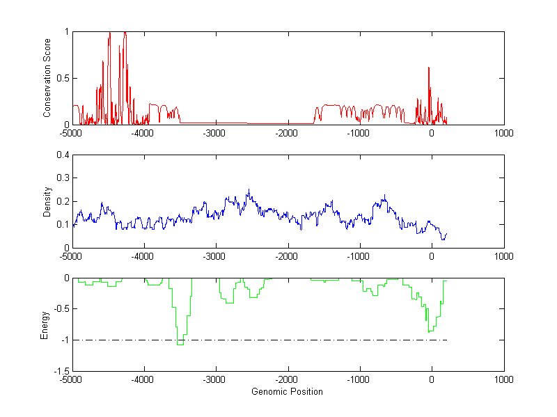 The energy profile (green curve) is about energy for module detection based on TF interaction. The positions with energy less than -1 indicate the existence of CRMs.