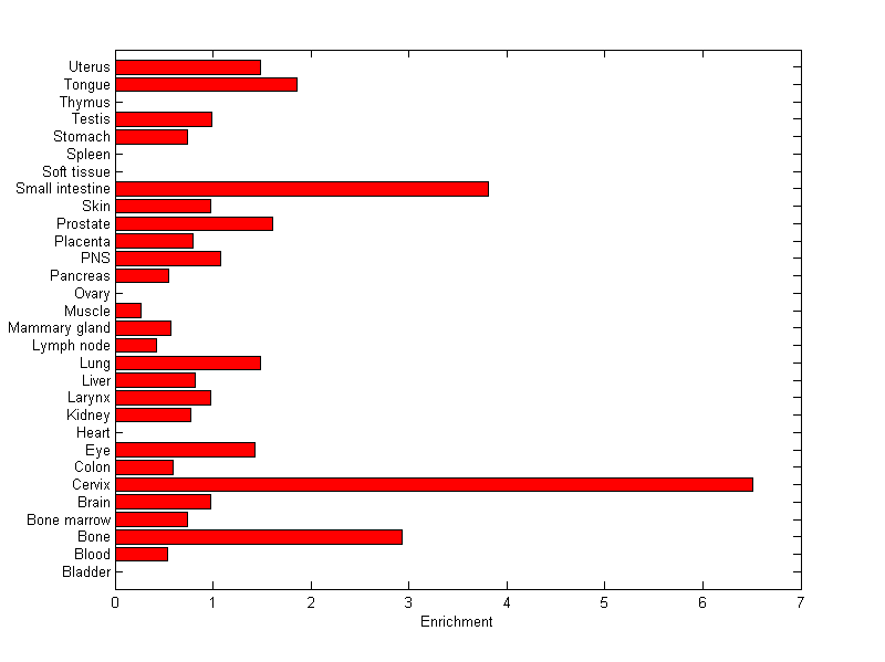 The expression level is normalized with tissue-library size. Each value for a gene in a tissue is a ratio of observed ESTs to the expected one in this tissue. The expected number of ESTs is the product of total ESTs of the gene and the fraction of total ESTs in the tissue among all ESTs in 30 tissues.