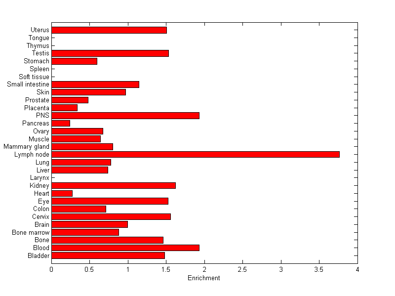 The expression level is normalized with tissue-library size. Each value for a gene in a tissue is a ratio of observed ESTs to the expected one in this tissue. The expected number of ESTs is the product of total ESTs of the gene and the fraction of total ESTs in the tissue among all ESTs in 30 tissues.