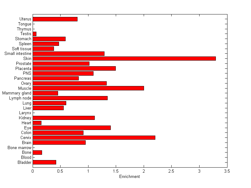The expression level is normalized with tissue-library size. Each value for a gene in a tissue is a ratio of observed ESTs to the expected one in this tissue. The expected number of ESTs is the product of total ESTs of the gene and the fraction of total ESTs in the tissue among all ESTs in 30 tissues.