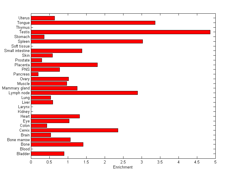 The expression level is normalized with tissue-library size. Each value for a gene in a tissue is a ratio of observed ESTs to the expected one in this tissue. The expected number of ESTs is the product of total ESTs of the gene and the fraction of total ESTs in the tissue among all ESTs in 30 tissues.