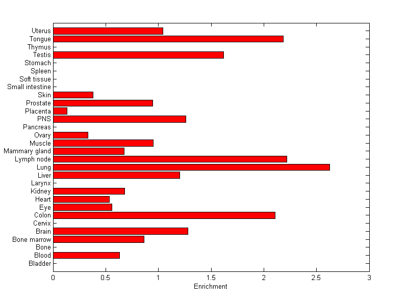 The expression level is normalized with tissue-library size. Each value for a gene in a tissue is a ratio of observed ESTs to the expected one in this tissue. The expected number of ESTs is the product of total ESTs of the gene and the fraction of total ESTs in the tissue among all ESTs in 30 tissues.