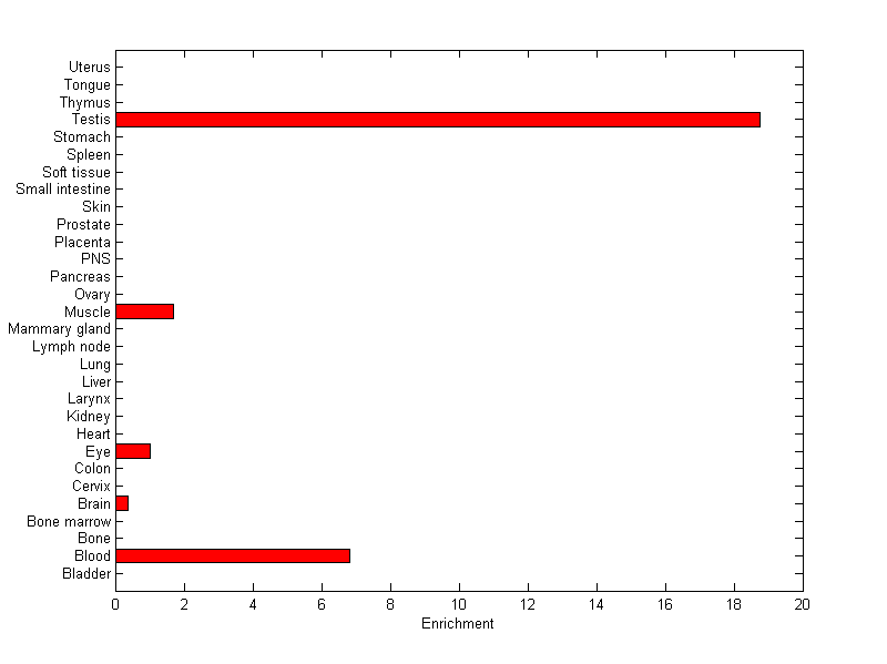 The expression level is normalized with tissue-library size. Each value for a gene in a tissue is a ratio of observed ESTs to the expected one in this tissue. The expected number of ESTs is the product of total ESTs of the gene and the fraction of total ESTs in the tissue among all ESTs in 30 tissues.