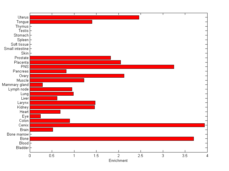The expression level is normalized with tissue-library size. Each value for a gene in a tissue is a ratio of observed ESTs to the expected one in this tissue. The expected number of ESTs is the product of total ESTs of the gene and the fraction of total ESTs in the tissue among all ESTs in 30 tissues.