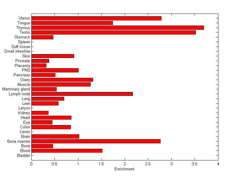 The expression level is normalized with tissue-library size. Each value for a gene in a tissue is a ratio of observed ESTs to the expected one in this tissue. The expected number of ESTs is the product of total ESTs of the gene and the fraction of total ESTs in the tissue among all ESTs in 30 tissues.