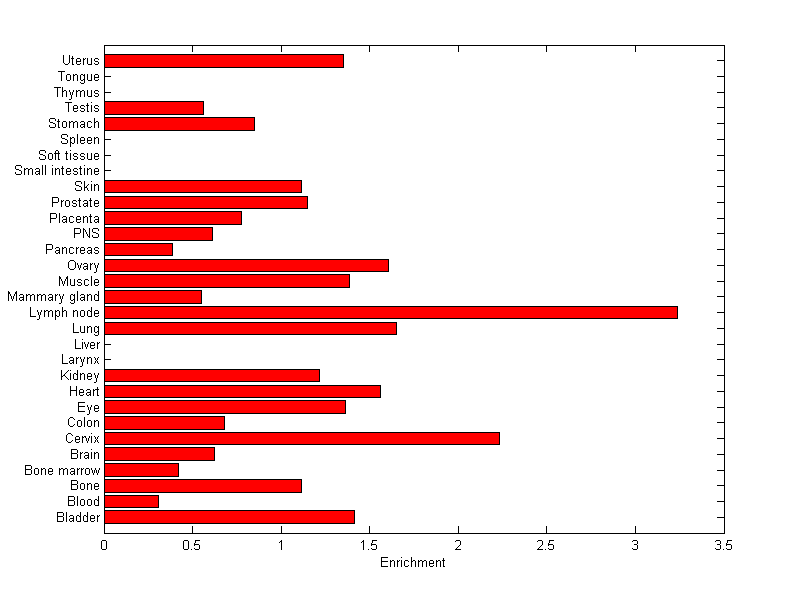 The expression level is normalized with tissue-library size. Each value for a gene in a tissue is a ratio of observed ESTs to the expected one in this tissue. The expected number of ESTs is the product of total ESTs of the gene and the fraction of total ESTs in the tissue among all ESTs in 30 tissues.