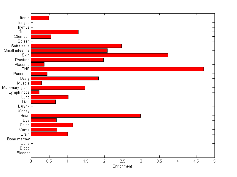 The expression level is normalized with tissue-library size. Each value for a gene in a tissue is a ratio of observed ESTs to the expected one in this tissue. The expected number of ESTs is the product of total ESTs of the gene and the fraction of total ESTs in the tissue among all ESTs in 30 tissues.