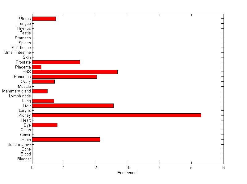 The expression level is normalized with tissue-library size. Each value for a gene in a tissue is a ratio of observed ESTs to the expected one in this tissue. The expected number of ESTs is the product of total ESTs of the gene and the fraction of total ESTs in the tissue among all ESTs in 30 tissues.