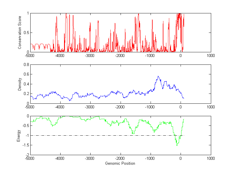 The energy profile (green curve) is about energy for module detection based on TF interaction. The positions with energy less than -1 indicate the existence of CRMs.