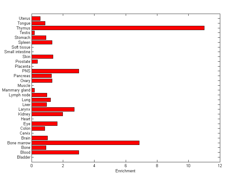 The expression level is normalized with tissue-library size. Each value for a gene in a tissue is a ratio of observed ESTs to the expected one in this tissue. The expected number of ESTs is the product of total ESTs of the gene and the fraction of total ESTs in the tissue among all ESTs in 30 tissues.