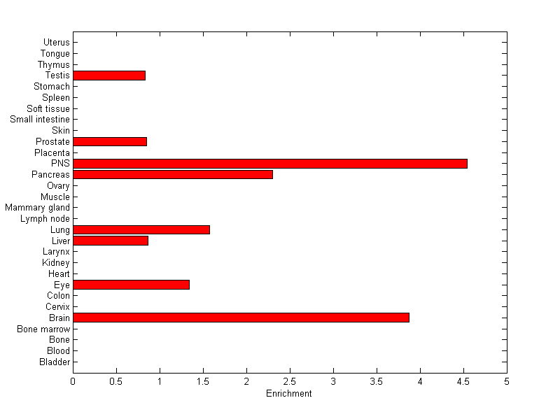 The expression level is normalized with tissue-library size. Each value for a gene in a tissue is a ratio of observed ESTs to the expected one in this tissue. The expected number of ESTs is the product of total ESTs of the gene and the fraction of total ESTs in the tissue among all ESTs in 30 tissues.