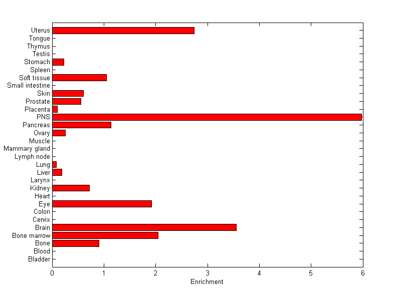 The expression level is normalized with tissue-library size. Each value for a gene in a tissue is a ratio of observed ESTs to the expected one in this tissue. The expected number of ESTs is the product of total ESTs of the gene and the fraction of total ESTs in the tissue among all ESTs in 30 tissues.