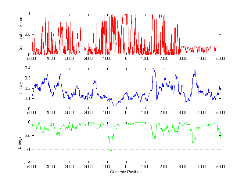 The energy profile (green curve) is about energy for module detection based on TF interaction. The positions with energy less than -1 indicate the existence of CRMs.