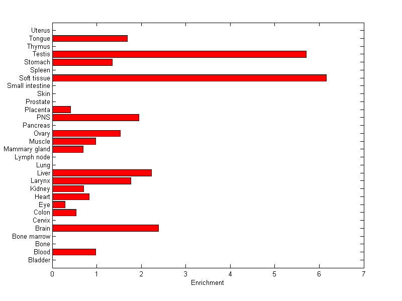 The expression level is normalized with tissue-library size. Each value for a gene in a tissue is a ratio of observed ESTs to the expected one in this tissue. The expected number of ESTs is the product of total ESTs of the gene and the fraction of total ESTs in the tissue among all ESTs in 30 tissues.