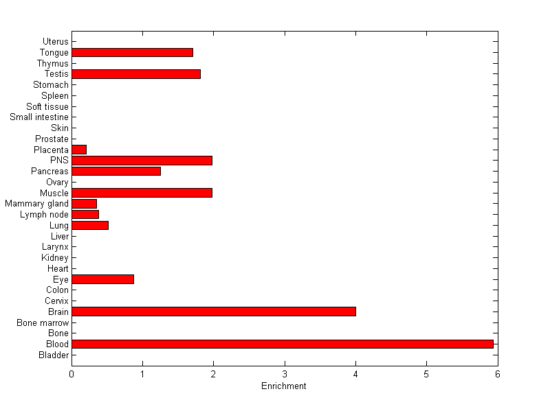 The expression level is normalized with tissue-library size. Each value for a gene in a tissue is a ratio of observed ESTs to the expected one in this tissue. The expected number of ESTs is the product of total ESTs of the gene and the fraction of total ESTs in the tissue among all ESTs in 30 tissues.