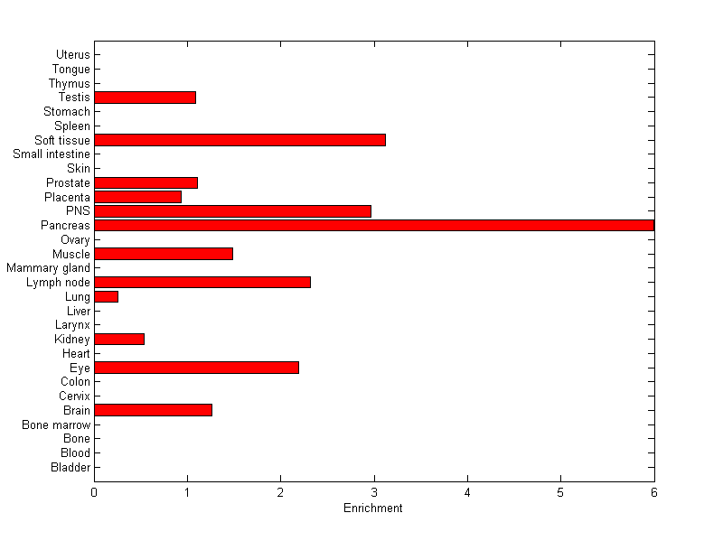 The expression level is normalized with tissue-library size. Each value for a gene in a tissue is a ratio of observed ESTs to the expected one in this tissue. The expected number of ESTs is the product of total ESTs of the gene and the fraction of total ESTs in the tissue among all ESTs in 30 tissues.