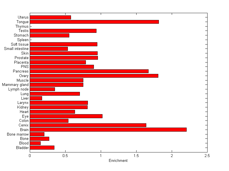 The expression level is normalized with tissue-library size. Each value for a gene in a tissue is a ratio of observed ESTs to the expected one in this tissue. The expected number of ESTs is the product of total ESTs of the gene and the fraction of total ESTs in the tissue among all ESTs in 30 tissues.