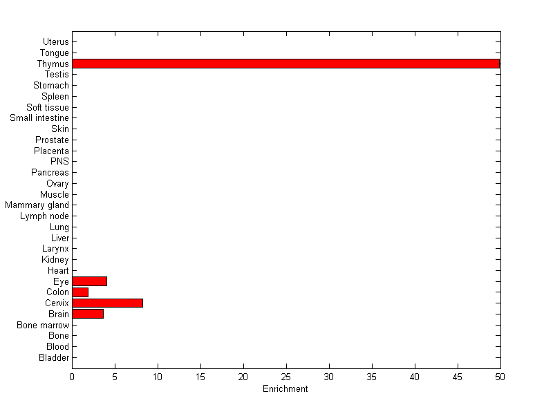The expression level is normalized with tissue-library size. Each value for a gene in a tissue is a ratio of observed ESTs to the expected one in this tissue. The expected number of ESTs is the product of total ESTs of the gene and the fraction of total ESTs in the tissue among all ESTs in 30 tissues.