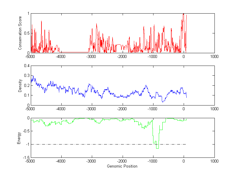 About the profiles: The conservation profile (red curve) is about conservation scores of the promoter sequences. Conservation was determined from an eight-way alignment of human, chimpanzee, dog, mouse, rat, chicken, zebrafish and fugu sequences. The conservation was quantified by a conservation score between 0 and 1, with 1 as highest conservation. The conservation score was obtained from UCSC genome databases. The density profile (blue curve) is about density of all TF binding sites. The energy profile (green curve) is about energy for module detection based on TF interaction. The positions with energy less than -1 indicate the existence of CRMs. Download: Conservation profileDensity profile Energy profile CRM summary |