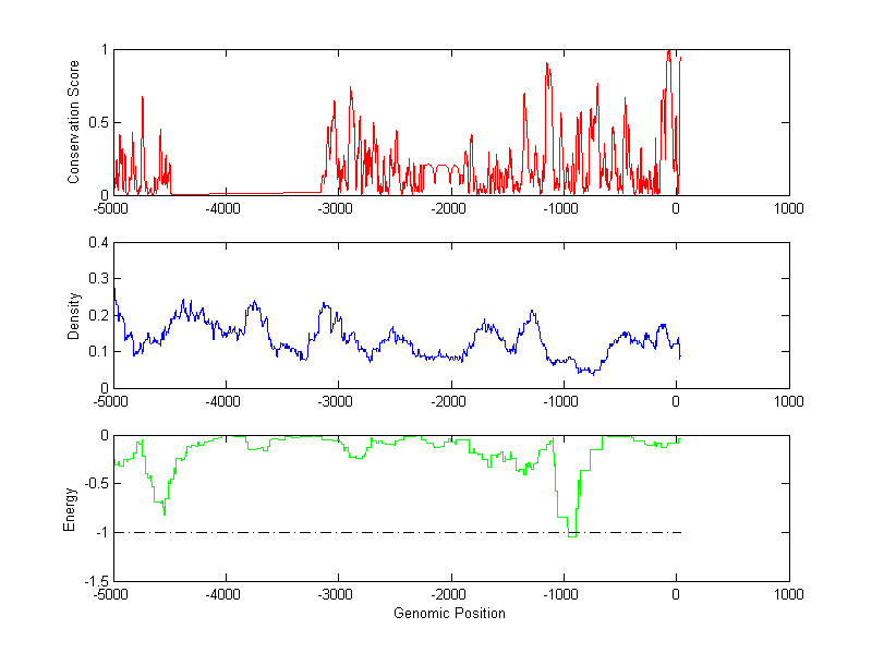 The energy profile (green curve) is about energy for module detection based on TF interaction. The positions with energy less than -1 indicate the existence of CRMs.