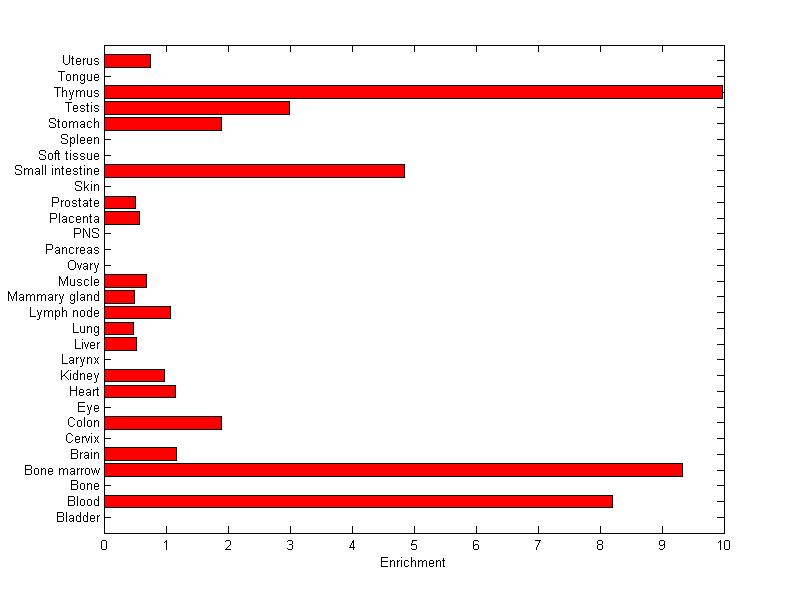 The expression level is normalized with tissue-library size. Each value for a gene in a tissue is a ratio of observed ESTs to the expected one in this tissue. The expected number of ESTs is the product of total ESTs of the gene and the fraction of total ESTs in the tissue among all ESTs in 30 tissues.