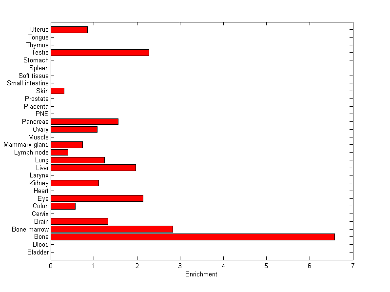 The expression level is normalized with tissue-library size. Each value for a gene in a tissue is a ratio of observed ESTs to the expected one in this tissue. The expected number of ESTs is the product of total ESTs of the gene and the fraction of total ESTs in the tissue among all ESTs in 30 tissues.