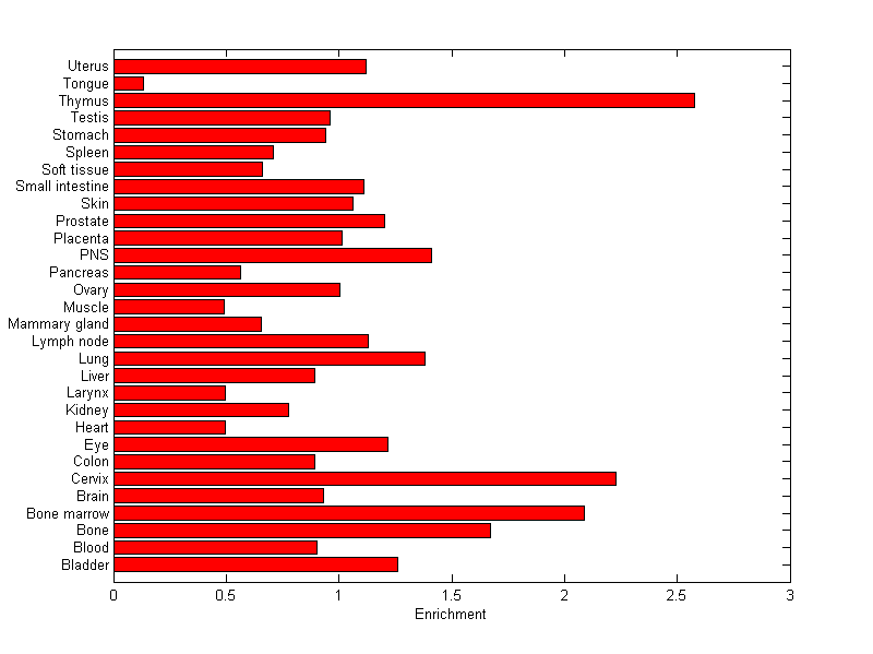 The expression level is normalized with tissue-library size. Each value for a gene in a tissue is a ratio of observed ESTs to the expected one in this tissue. The expected number of ESTs is the product of total ESTs of the gene and the fraction of total ESTs in the tissue among all ESTs in 30 tissues.