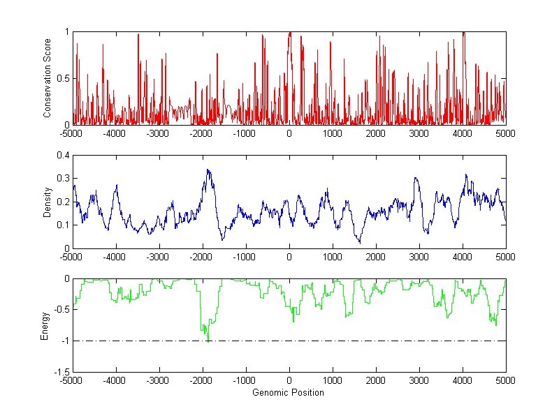 The energy profile (green curve) is about energy for module detection based on TF interaction. The positions with energy less than -1 indicate the existence of CRMs.