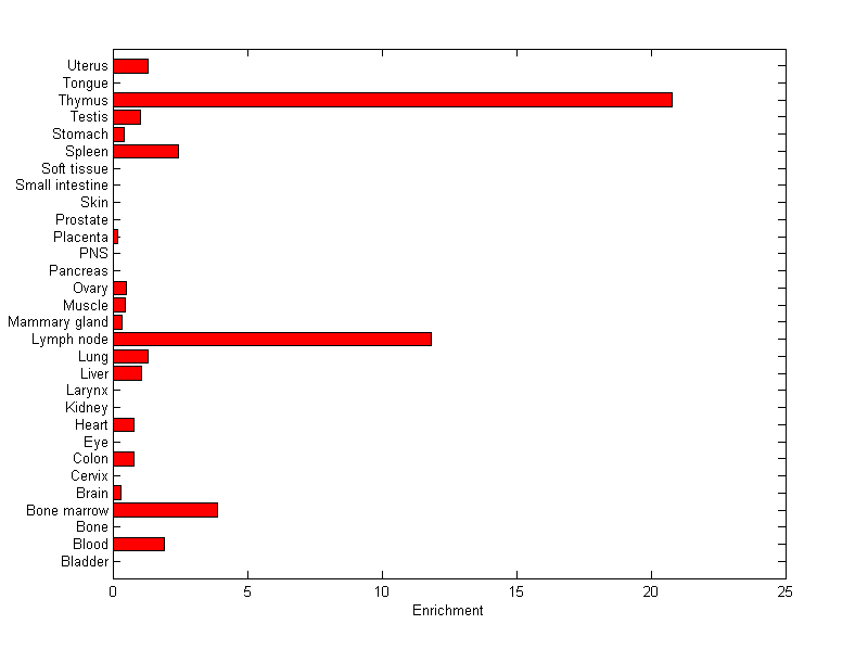 The expression level is normalized with tissue-library size. Each value for a gene in a tissue is a ratio of observed ESTs to the expected one in this tissue. The expected number of ESTs is the product of total ESTs of the gene and the fraction of total ESTs in the tissue among all ESTs in 30 tissues.