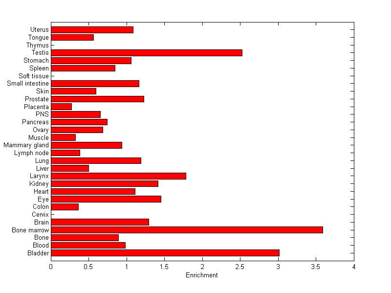 The expression level is normalized with tissue-library size. Each value for a gene in a tissue is a ratio of observed ESTs to the expected one in this tissue. The expected number of ESTs is the product of total ESTs of the gene and the fraction of total ESTs in the tissue among all ESTs in 30 tissues.
