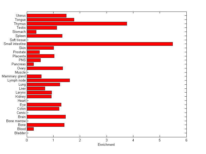 The expression level is normalized with tissue-library size. Each value for a gene in a tissue is a ratio of observed ESTs to the expected one in this tissue. The expected number of ESTs is the product of total ESTs of the gene and the fraction of total ESTs in the tissue among all ESTs in 30 tissues.