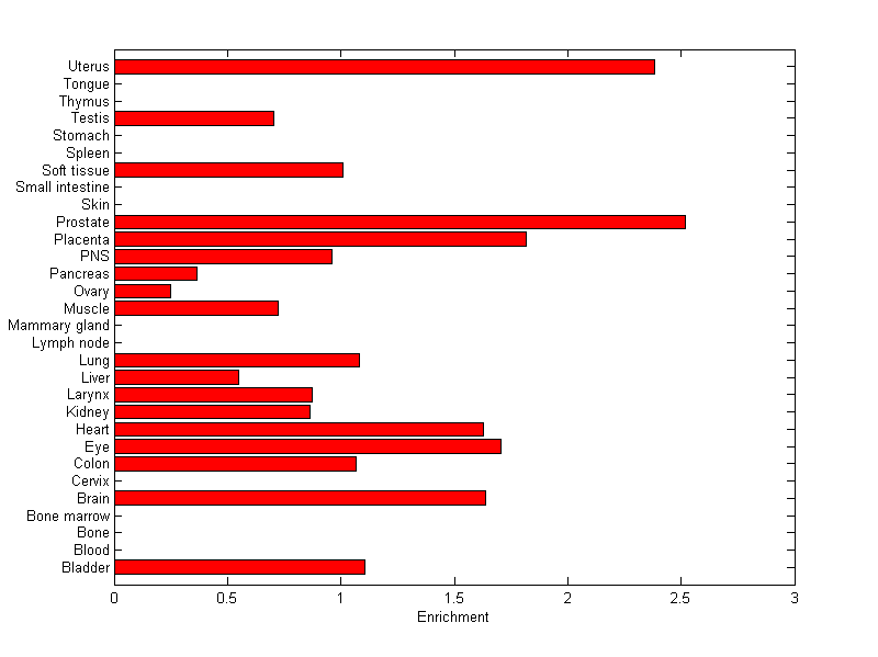 The expression level is normalized with tissue-library size. Each value for a gene in a tissue is a ratio of observed ESTs to the expected one in this tissue. The expected number of ESTs is the product of total ESTs of the gene and the fraction of total ESTs in the tissue among all ESTs in 30 tissues.